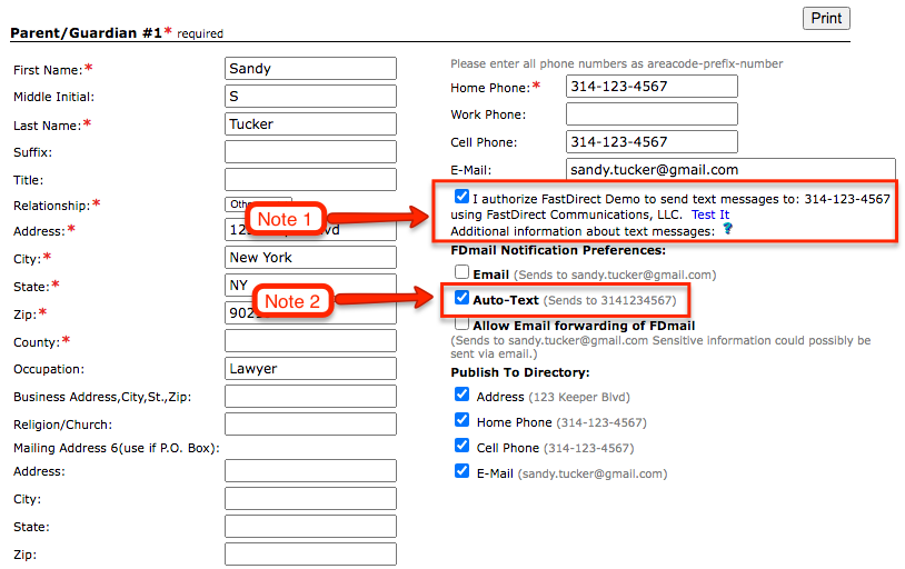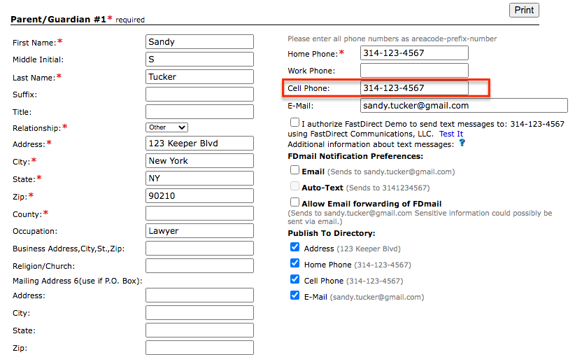 Enter in a cell phone number for Parent/Guardian #1 and/or